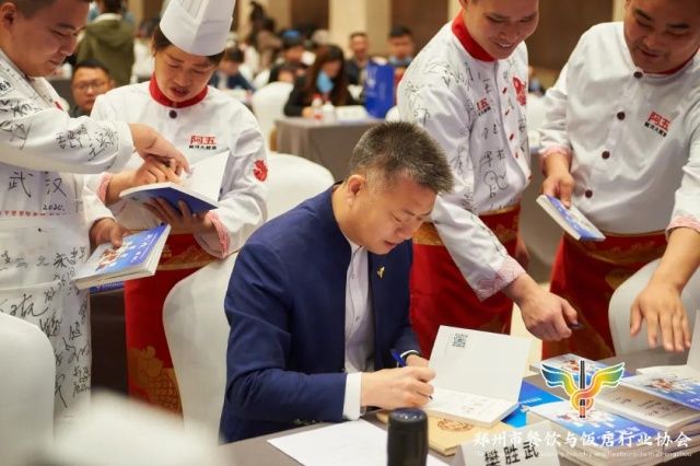 表彰大会现场阿五黄河大鲤鱼创始人樊胜武在《战疫日记》上签名赠送给厨师